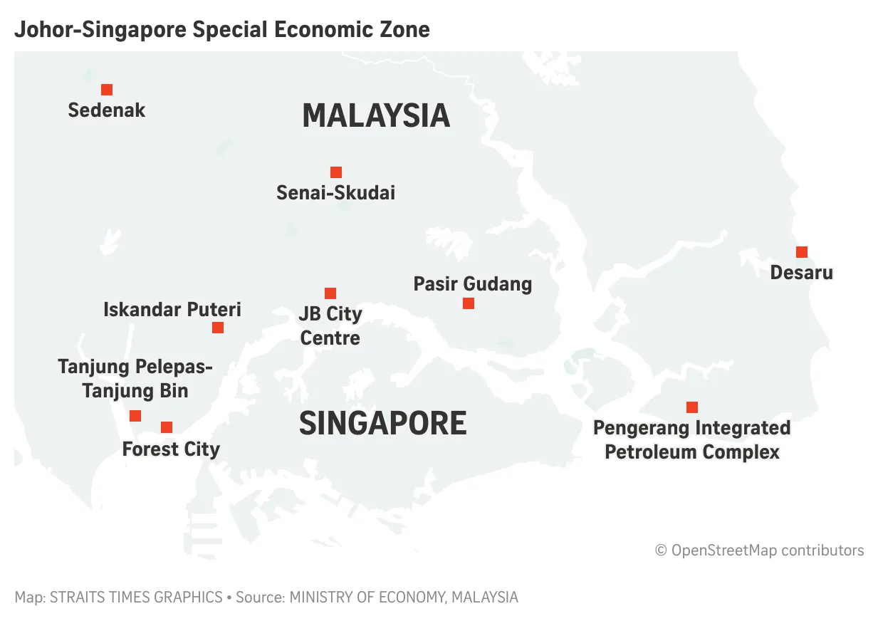 The New SEZ SEZ will consist of Johor Bahru City Centre, Iskandar Puteri, Tanjung Pelepas-Tanjung Bin, Pasir Gudang, Senai-Skudai, Sedenak, Forest City, Pengerang Integrated Petroleum Complex (PIPC) and Desaru. However, this is pending confirmation from the government.