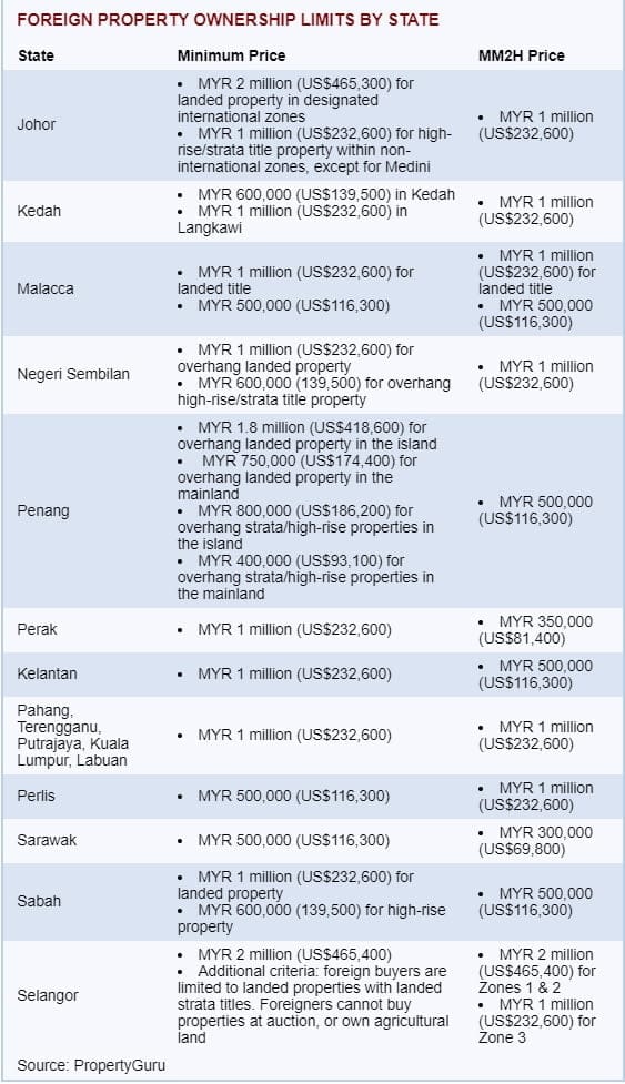 In Kuala Lumpur, as well as in Perak, Kelantan, Putrajaya, Labuan, Pahang and Terengganu, the minimum investment requirement is MYR 1 million (US$ 232,600), while it is only MYR 500,000 (US$116,300) in Perlis and Sarawak. Other states have different foreign property ownership limits too, as shown in table below.