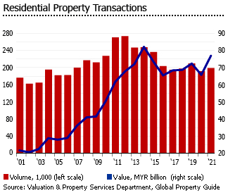 In 2021, financial easing policies fuelled the property market, with the total number of residential property transactions in Malaysia rising by 3.9% to 198,812 units from a year earlier, in contrast to a 8.6% decline in 2020 due to the pandemic, according to JPPH. In terms of value, transactions increased strongly by 16.7% y-o-y to MYR 76.9 billion (US$18.06 billion) over the same period.