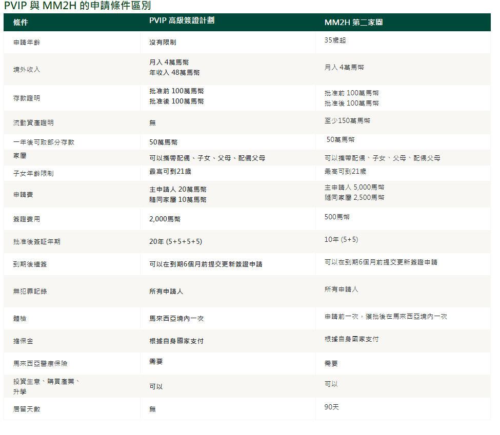 - 計劃沒有年齡限制,申請人的離岸收入需達到每月4萬馬幣(約28萬台幣)或每年48萬馬幣(約336萬台幣)且有至少100萬馬幣的定期存款(約700萬台幣),且不能提取本金,只能在一年後以醫療、教育、購買物業為由,提取五成定期存款本金。