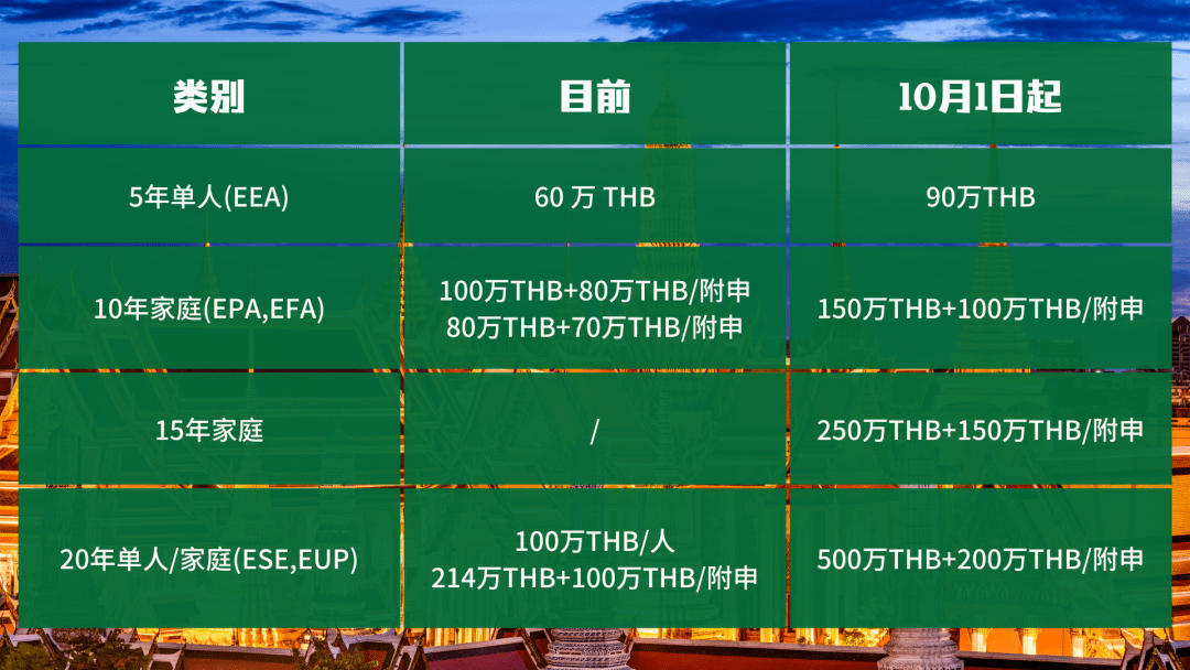 据悉,10月起,泰国精英签证各类别将大幅涨价。5年单人计划的投资门槛将从60万泰铢涨至90万泰铢,10年家庭计划投资门槛涨至150万泰铢,20年单人或家庭计划的投资门槛更是猛涨至500万泰铢。