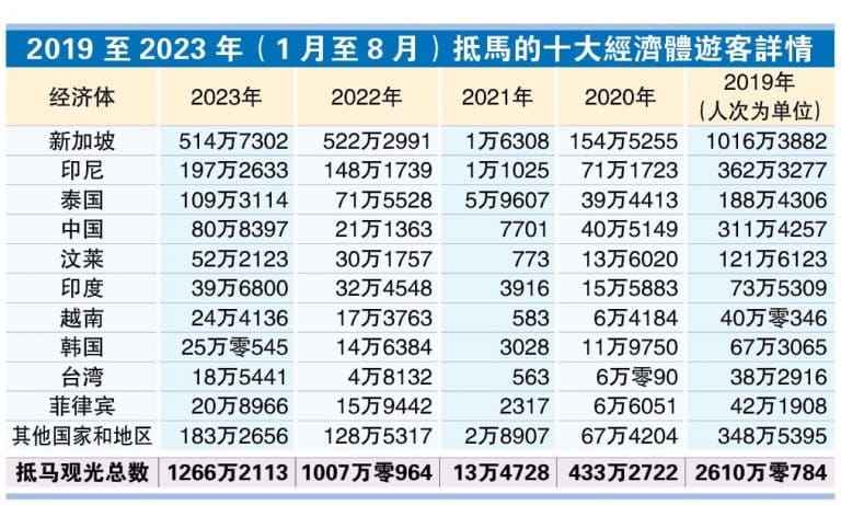 他指出,从2019至2023年(1至8月)来马旅游的外国总人数分别为1811万2110人、428万3288人、6万4878人、431万1003人、1266万2113人;也就是以2023年跟2019年相比,仍出现30.1%萎缩(详情见表)。